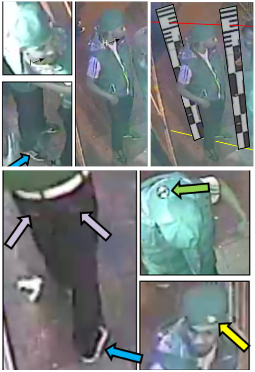 Shown in the graphics are examples of the analysis techniques which included clothing comparison and photogrammetry. The example shows the centre of the scale board as it passes through Person X’s ground nadir - the point on the ground directly below the uppermost height of the subject.